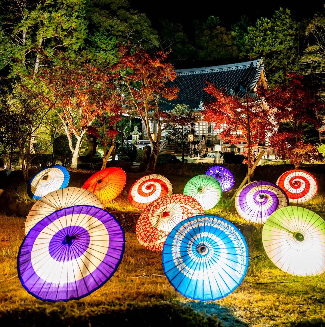 華やかな和傘のライトアップは、色鮮やかで目が釘付けに!