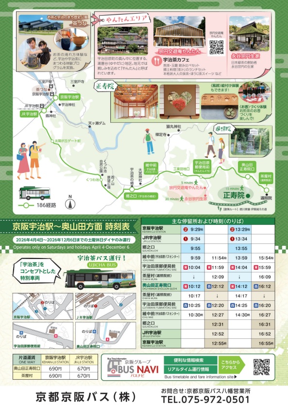 「お茶の京都グリーンライナー」や「宇治奥山田茶屋村線(186系統)」沿線で楽しめるスポットやお店等を紹介したパンフレットを作成しました。