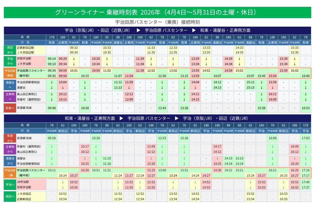 【▶JR宇治駅(9:10発)京阪宇治駅(9:14発)⇒(グリーンライナー178系統)⇒和束運動公園前(9:47着)】