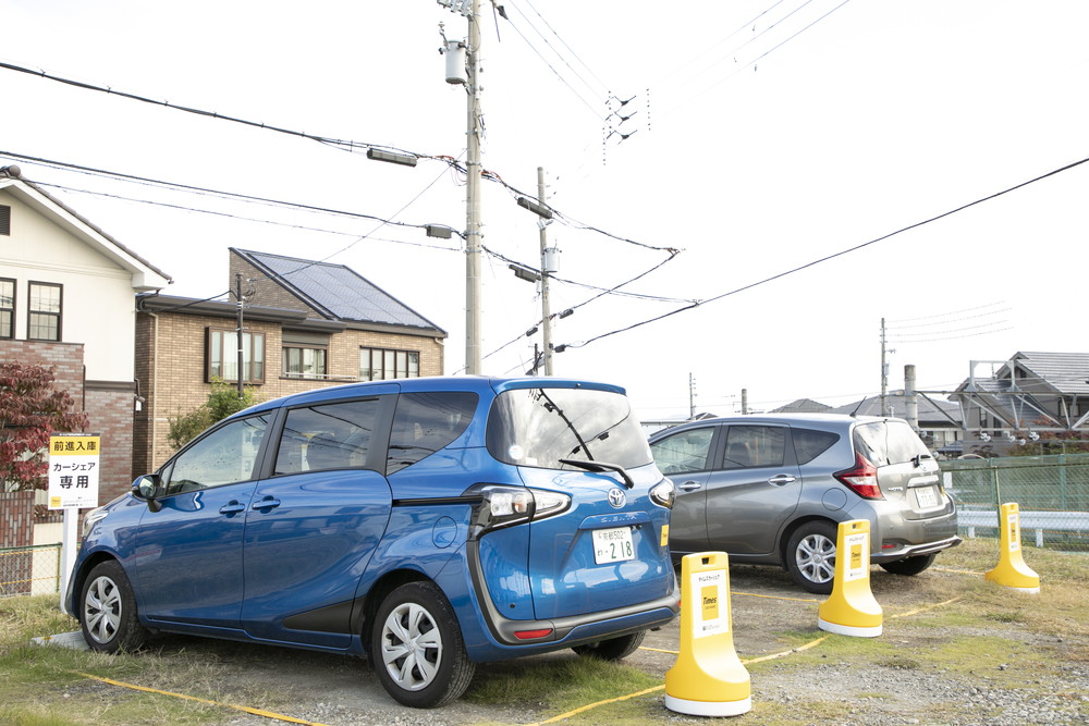 あらかじめ予約しておいたJR松井山手駅前のカーシェアステーションへ。タイムズのマークの付いた駐車スペースに車がスタンバイしてあるのでとてもわかりやすく、出発までの手順もカンタン!